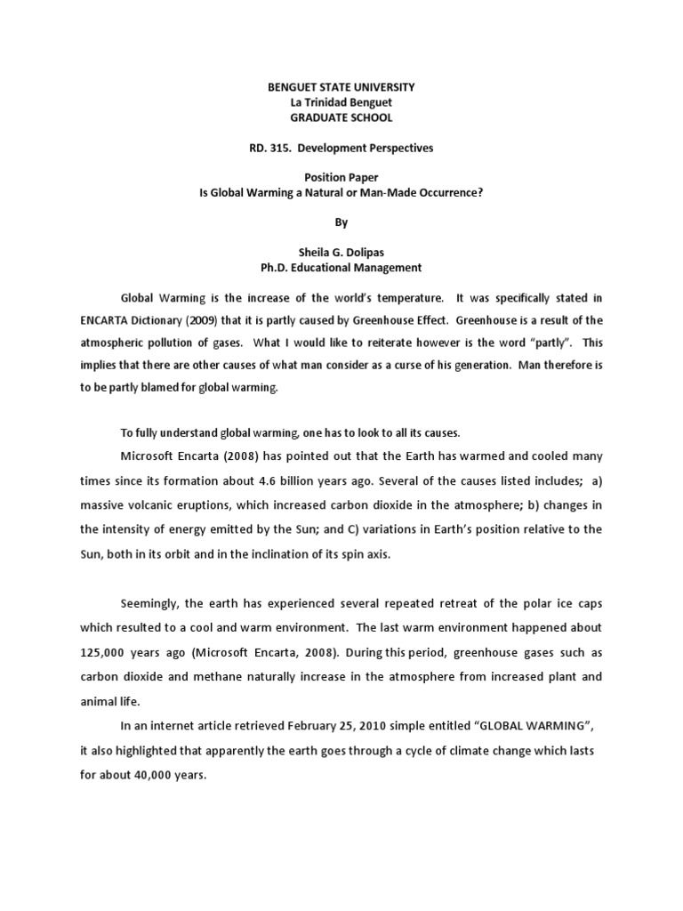 An example of this is the recently I have read an essay about climate change and global warming. Climate change is a change in global or regional climate patterns. The position that will be supported in this paper is that climate change is a fact and americans in the u.s. Position paper of the delegate of the federation of malaysia to the united nations delivered by tonni hasan on 1. Outlining the topic to be discussed Whether it be brought up and discussed in politics, school, family, or friends, some people still limit using those words when in casual conversation. 2 helpage position paper introduction the impact of climate change on an ageing global population is creating a nexus of vulnerability which is set to increase over the coming decades. Various types of adaptation can be distinguished, including transformational, incremental and autonomous adaptation (ipcc ar5 climate change 2014: Here's a deeper look at how climate change affects the philippines and the role geography and development play in making a tremendous challenge even greater. Sample essays on climate change. Reading out their position papers). Position paper on climate change july, 2012.